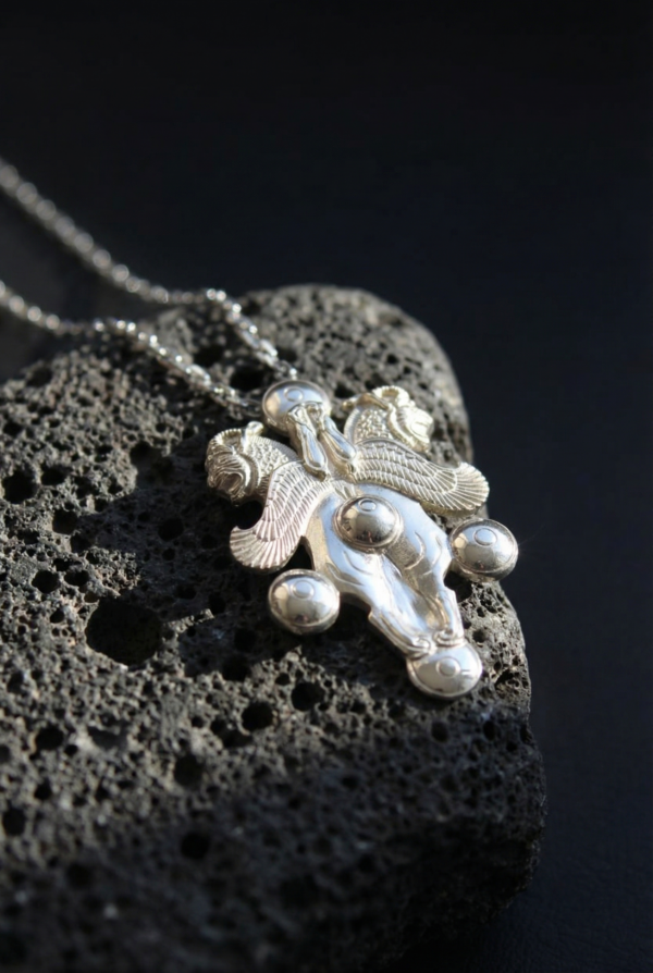 The Persepolis Pendant is a stunning reimagination of an ancient Persian artifact from the heart of the Achaemenid Empire, brought back to life in fine 925 sterling silver. Inspired by an original gold ornament housed in The Metropolitan Museum of Art, New York, this pendant is a wearable piece of history — where power, art, and mythology converge.