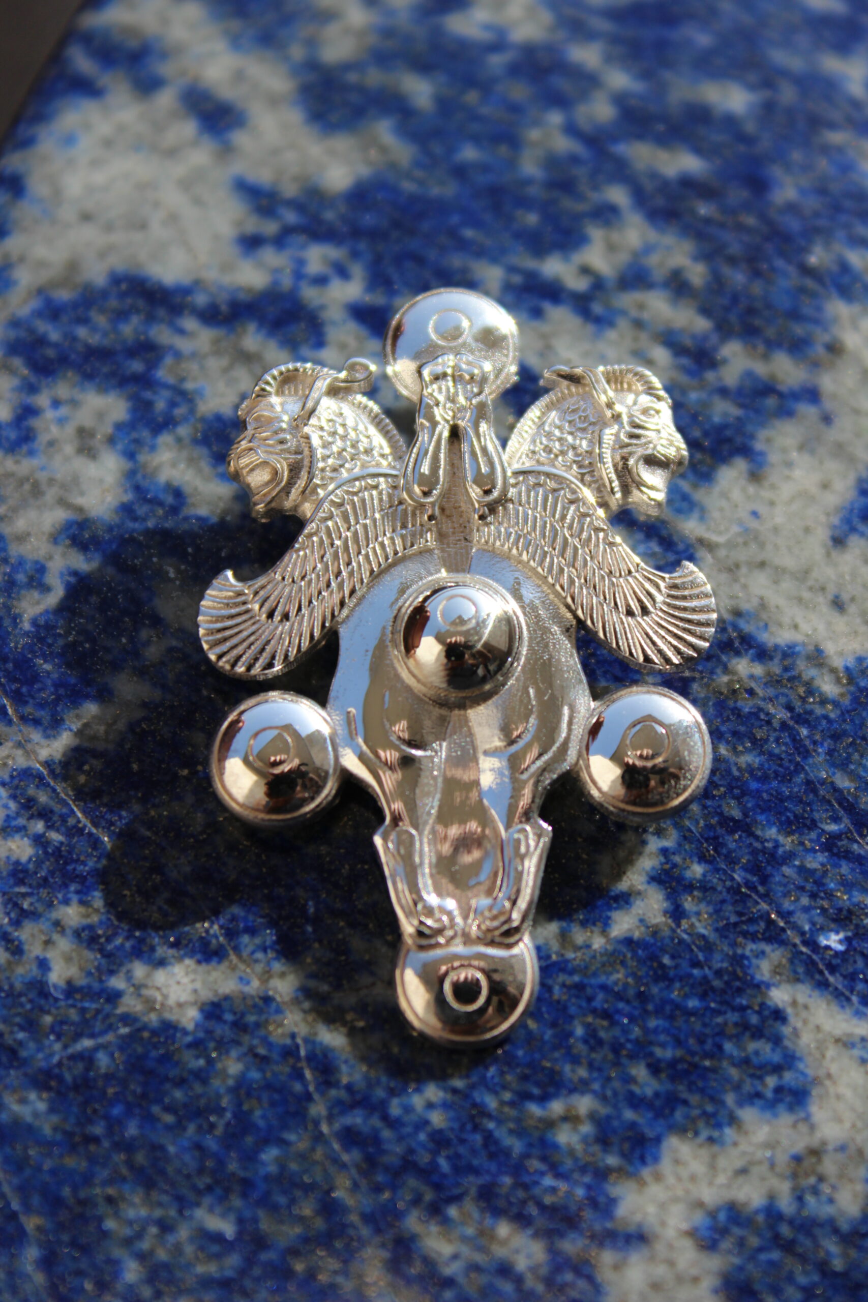 With its intricately detailed twin winged lion-monsters, bull-like ears, and curled horns, this powerful design symbolizes strength, balance, and cosmic energy. Stylized wings span across the form, surrounding five circular bosses that represent harmony and celestial unity.